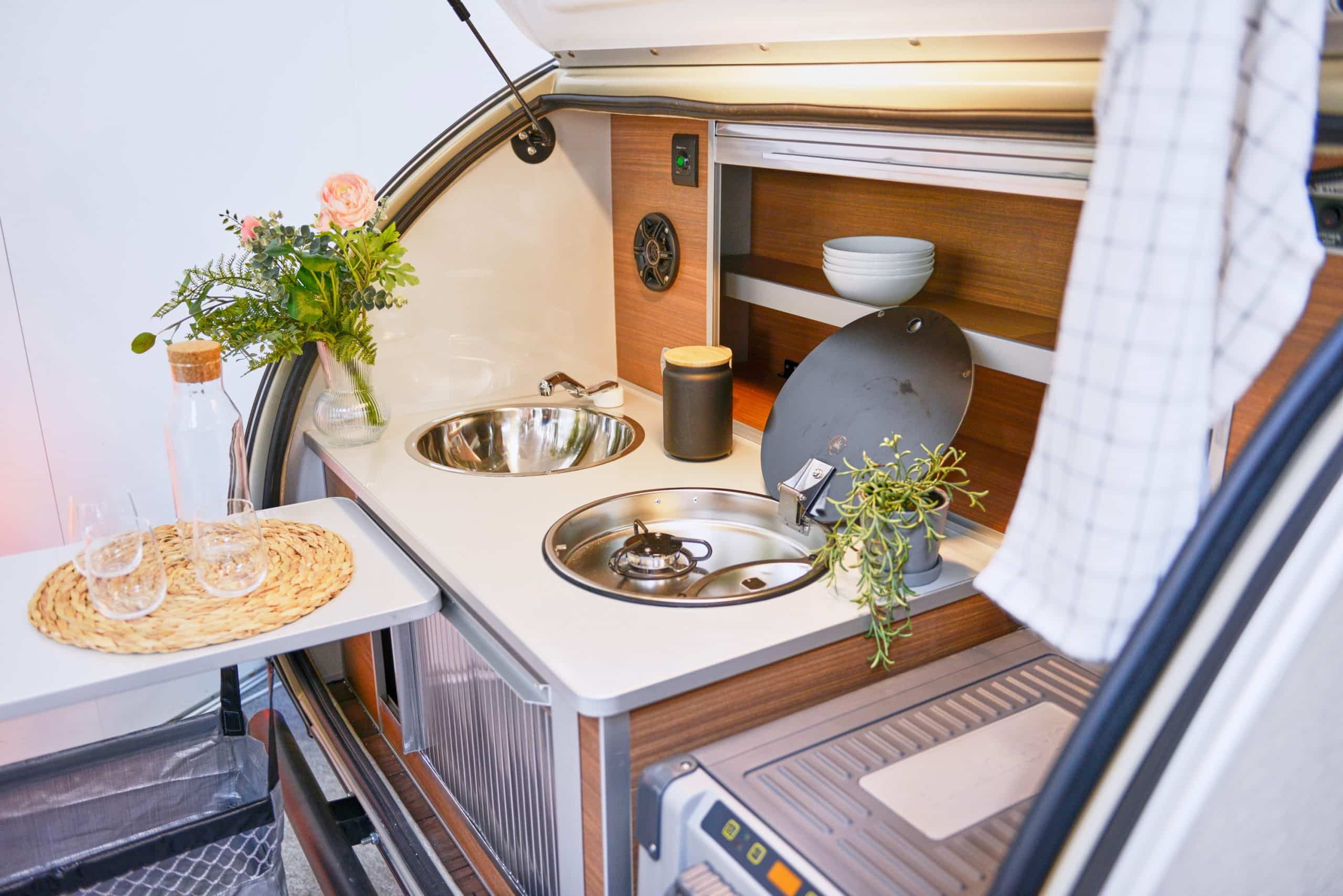 Dapur Teardrop Caravan ini bisa diakses dari dalam maupun luar! Tersedia dalam empat pilihan warna. Tentunya, berbagai aksesori tambahan juga tersedia sesuai kebutuhan.