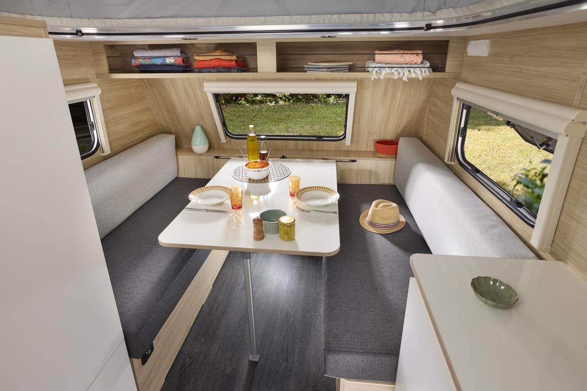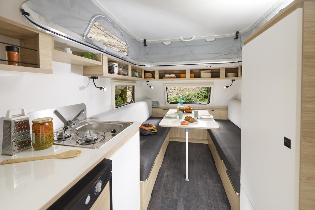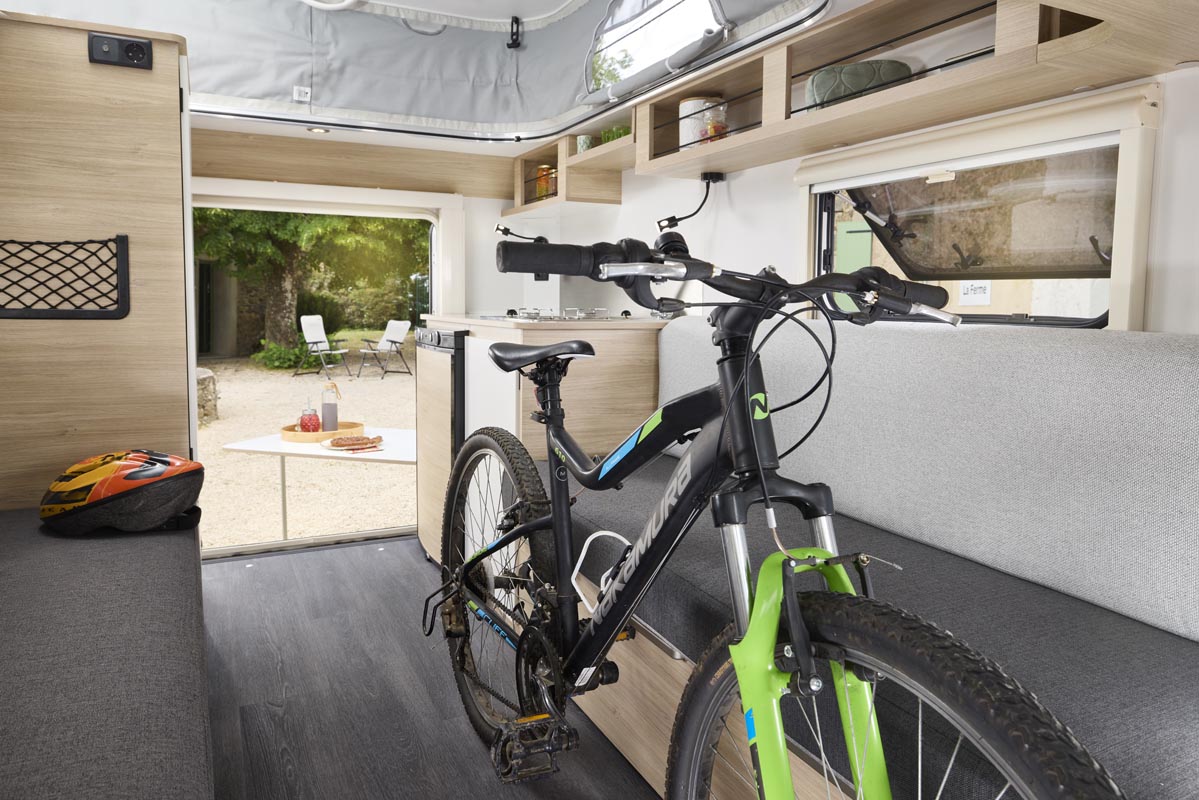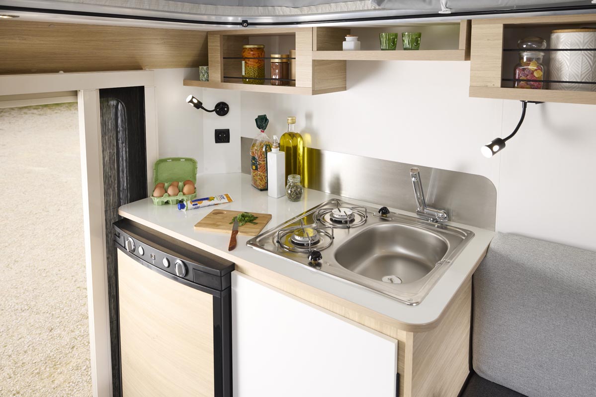 Karavan medium ini juga menyediakan ruang untuk tiga orang, bahkan bisa menampung empat orang tambahan dengan tenda atap dan ranjang fleksibel di bagian dalam. Dilengkapi dapur camping lengkap, rak sepeda, dan tentu saja ruang penyimpanan yang cukup. Tersedia dalam empat pilihan warna tanpa biaya tambahan, serta bisa ditambah berbagai aksesori lainnya.